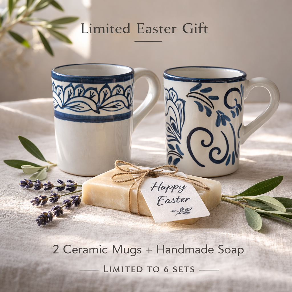 A hand-painted ceramic mug or cup paired with a thick handmade soap — an elegant alternative to chocolate this Easter.